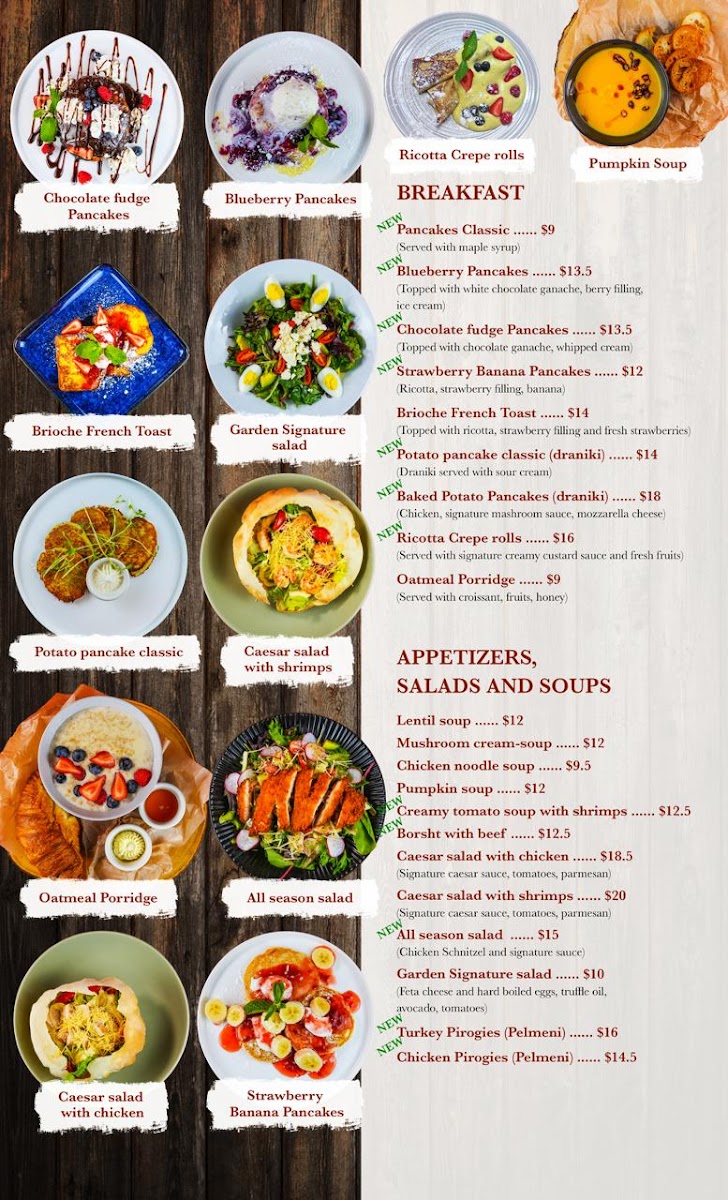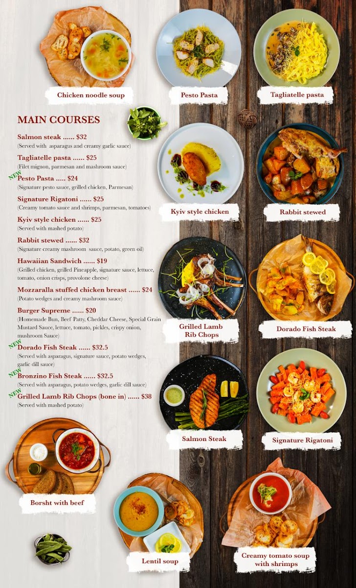 The salads here are vibrant and unique, featuring options like the refreshing Garden Salad and the indulgent Caesar with grilled chicken, all beautifully plated. For the main dishes, the Kiyev Style Cutlet stands out, served alongside creamy mashed potatoes, while the Salmon Steak offers a rich experience with asparagus and garlic sauce. Not to be missed, the Burger Supreme tantalizes with house-ground beef and a signature sauce.